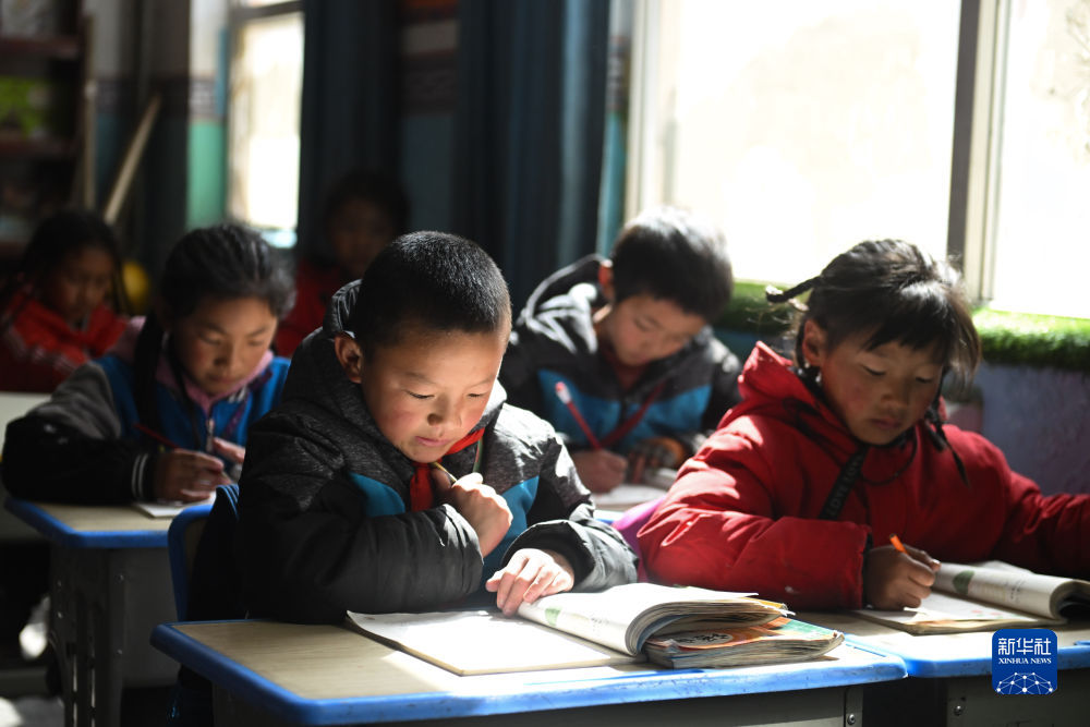 4月22日,青海省玉樹(shù)藏族自治州曲麻萊縣巴干鄉(xiāng)寄宿制小學(xué)的學(xué)生在課堂上學(xué)習(xí)。新華社記者 張龍 攝