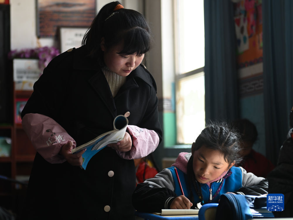 4月22日,青海省玉樹(shù)藏族自治州曲麻萊縣巴干鄉(xiāng)寄宿制小學(xué)的教師王芳(左)在指導(dǎo)學(xué)生學(xué)習(xí)。新華社記者 張龍 攝