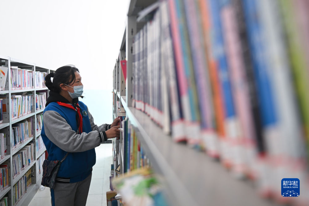 4月22日,青海省玉樹(shù)藏族自治州曲麻萊縣巴干鄉(xiāng)寄宿制小學(xué)的學(xué)生在圖書室借閱圖書。新華社記者 張龍 攝