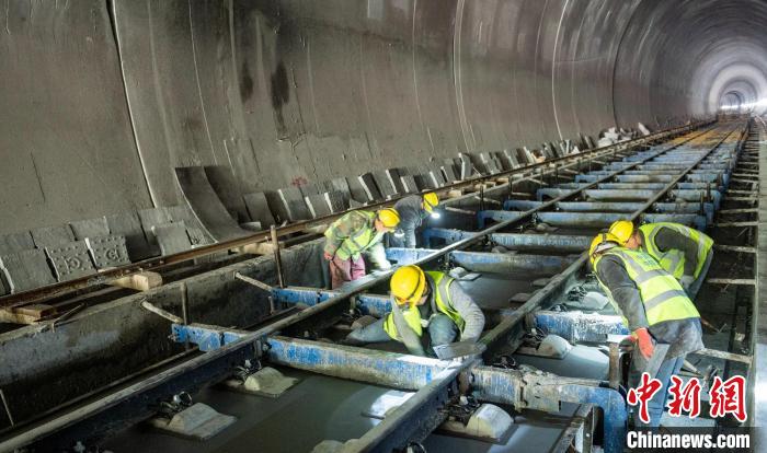 隧道內(nèi)工人師傅正在進(jìn)行無砟道床施工。劉忠俊 攝