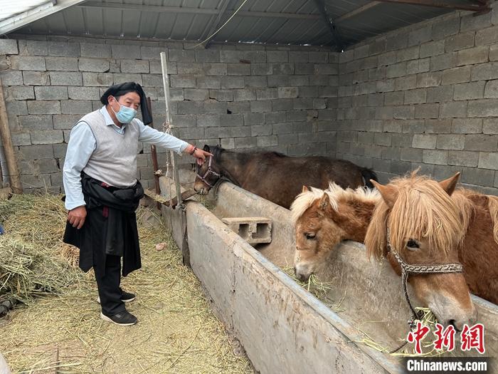 4月27日,才哇在生態(tài)畜牧業(yè)合作社內(nèi)飼喂馬匹。 中新社記者 李江寧 攝