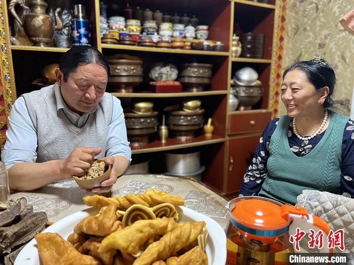 4月27日,才哇與妻子在家中吃早餐。 中新社記者 李江寧 攝