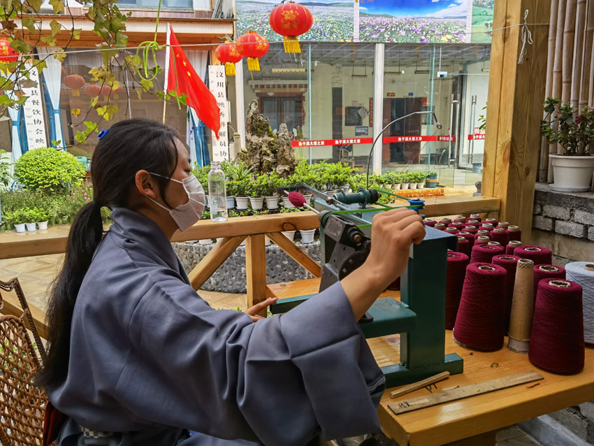 2022年5月12日,“5·12”汶川特大地震抗震救災(zāi)14周年紀(jì)念日,山鷹帶著幾個(gè)員工來到漁子溪,在汶川縣黨委、映秀鎮(zhèn)黨委、漁子溪村兩委及當(dāng)?shù)厝罕姷臒崆閹椭拢e辦了“藍(lán)措馬”品牌圍巾展示活動(dòng)。村里還積極幫助他們尋找合適的房屋作為編織車間,讓他們先在漁子溪站住腳。