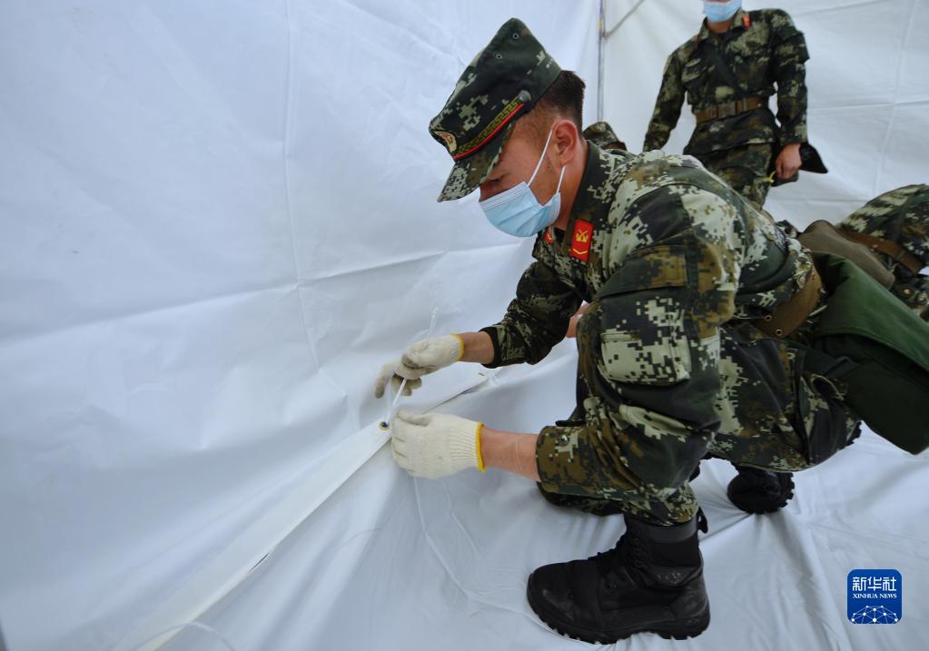 6月10日,在馬爾康市州醫(yī)院背后廣場安置點內(nèi),武警阿壩支隊隊員在搭建帳篷。新華社記者 劉坤 攝