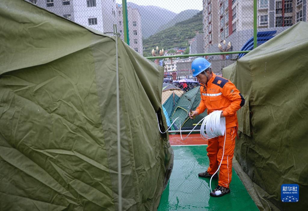 6月10日,在馬爾康市州醫(yī)院背后廣場安置點內(nèi),國家電網(wǎng)工作人員在鋪設(shè)電線。新華社記者 劉坤 攝