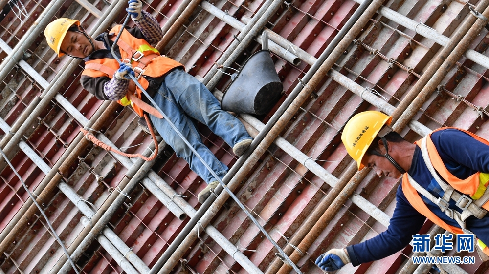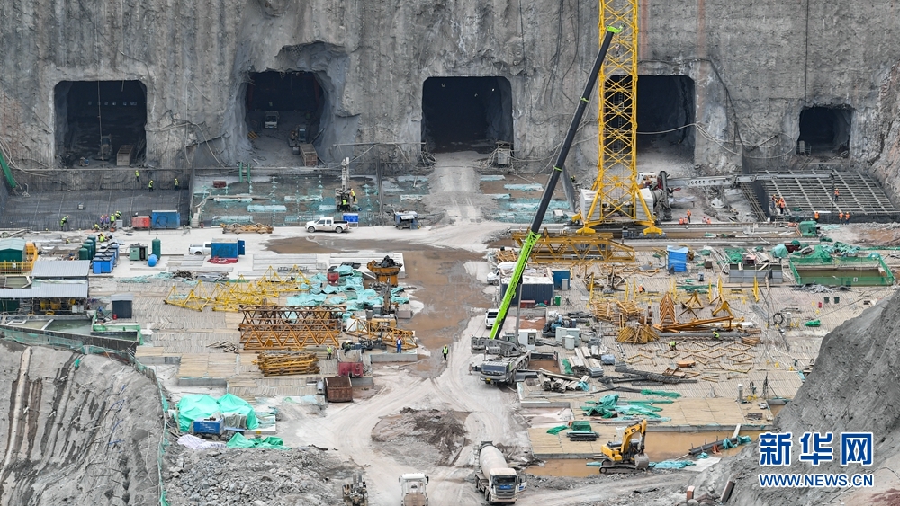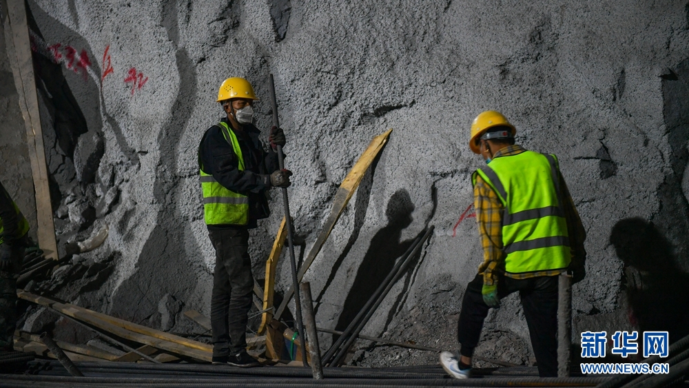 工人在地下廠房施工現(xiàn)場(chǎng)作業(yè)。