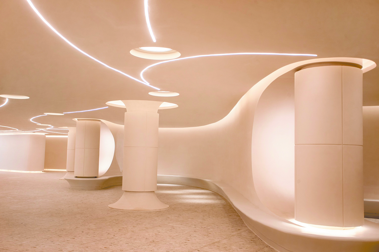 “看見九寨”大樓內(nèi)的10余個空間里,設(shè)計團(tuán)隊用不同的色彩和科技表現(xiàn)手法表達(dá)出不同的舒緩風(fēng)格,治愈人心。“獨自醒來”藝術(shù)館運用弧形和曲線,將空間切割出曼妙的身形,輕盈靈動,淺黃柔色的燈光彌漫著溫柔氣息;以白色調(diào)為主的“九寨時光”圖書館,能讓人從浮躁中快速安靜下來。