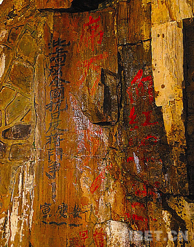 圖為一九三五年七月,中國(guó)工農(nóng)紅軍二方面軍第六軍團(tuán)在長(zhǎng)征途中,曾路過班瑪、久治一帶,并在班瑪絨玉地區(qū)的森林石壁上刻下的“北上響應(yīng)全國(guó)抗日反蔣斗爭(zhēng)”的標(biāo)語