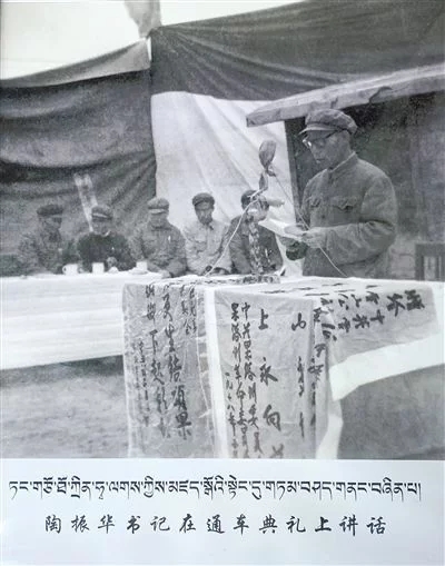 圖為1952年8月工作團在達日縣查郎寺召開果洛頭人、代表聯(lián)誼會議,扎喜旺徐團長在聯(lián)誼會議上作有關(guān)民族團結(jié)的報告。圖片由央金提供