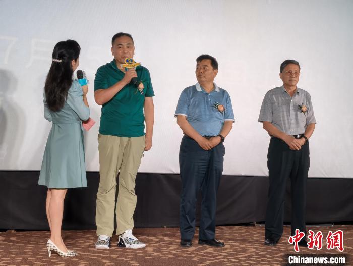 圖為總導演李曉、主演葛玉修,參與電影創(chuàng)作的廣電協(xié)會會長韓青峰接受采訪。祁增蓓 攝