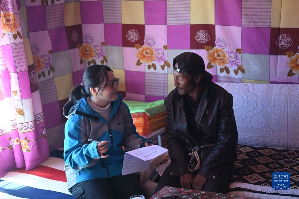 在唐古拉山鎮(zhèn),汪鈺婷在牧民家中進(jìn)校訪談。新華社記者 張龍攝