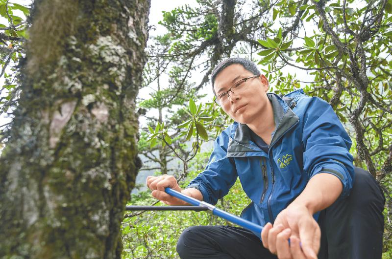 垂直距離只有300米,但密林中的行進并不容易。在向?qū)ьI下,王文志和其學生抵達了林線處,腳踩松軟的苔蘚,他們展開作業(yè)。