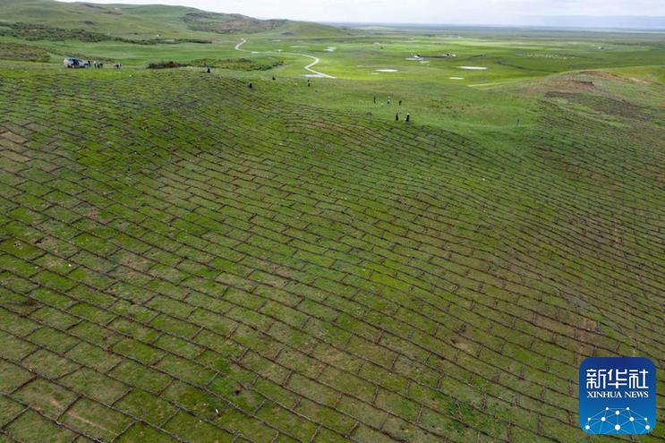 7月25日,在若爾蓋縣麥溪鄉(xiāng)黑河村,村民用高原柳編成沙障(無人機(jī)拍攝)。新華社記者 江宏景 攝