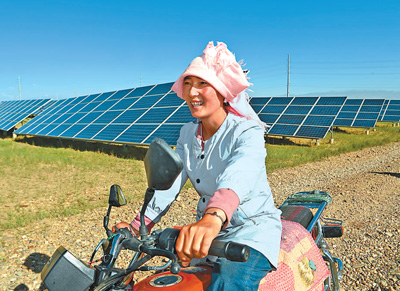 落日余暉中,牧民索南卓瑪騎著一輛摩托車,沿著歸家的方向,緩緩跟在羊群后面。“自從裝了光伏板,生態(tài)治理同步發(fā)力,一些戈壁灘變成了綠地,我們的生活也越來越好了?!睂ρ矍巴恋匕l(fā)生的變化,生于斯長于斯的索南卓瑪深有感觸。