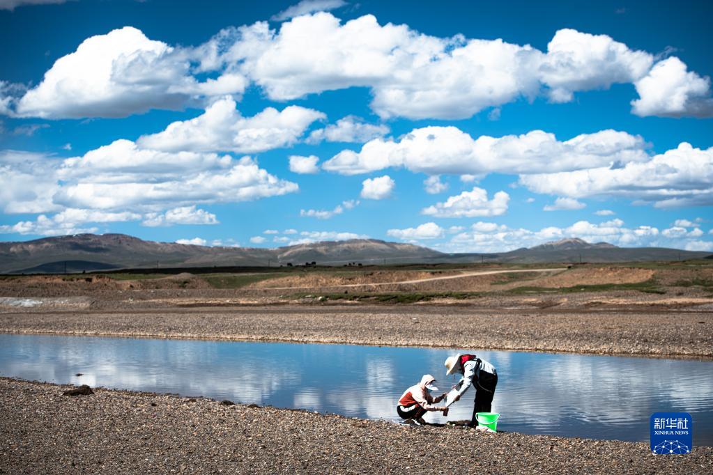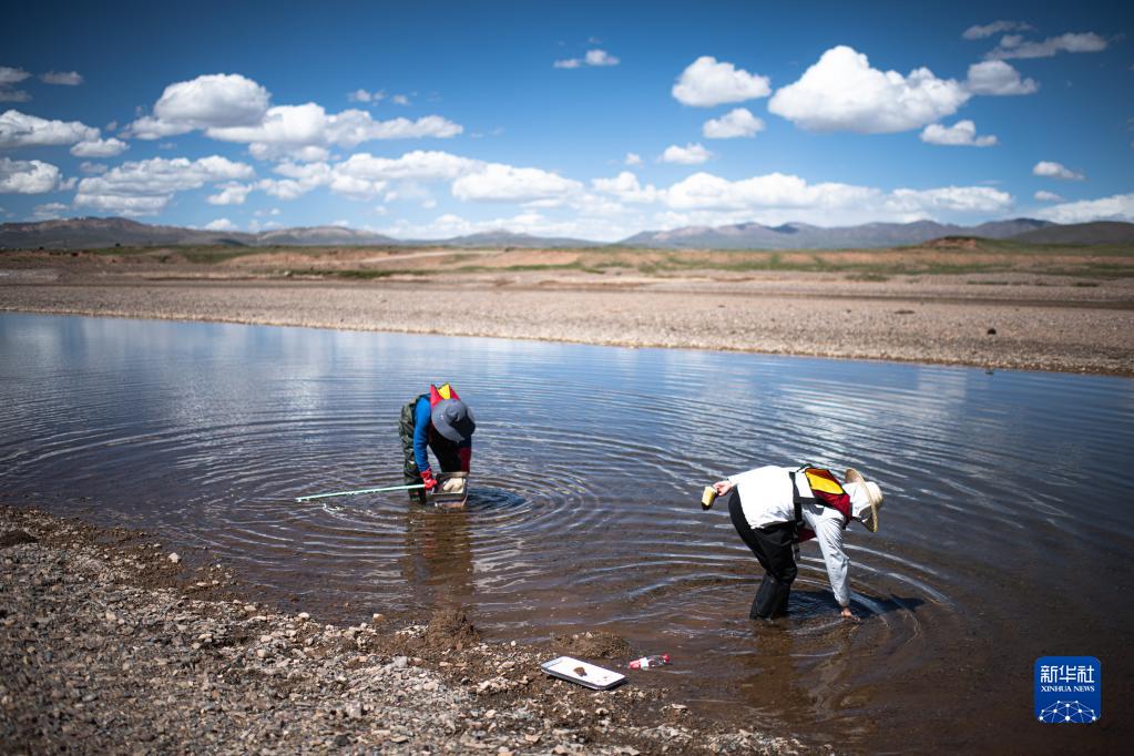 7月25日,長江科學(xué)院科考隊員在采集底棲動物樣本。 新華社記者 肖藝九 攝