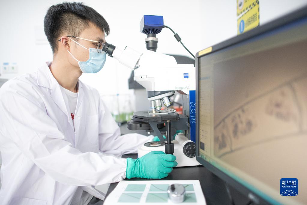 8月3日,在長江科學(xué)院實驗室,科研人員對長江源區(qū)采集的藻類樣本進(jìn)行鑒定。 新華社記者 肖藝九 攝