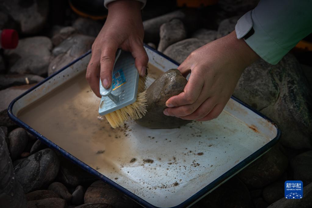 7月24日,長江科學(xué)院科考隊員在采集底棲動物樣本。 新華社記者 肖藝九 攝
