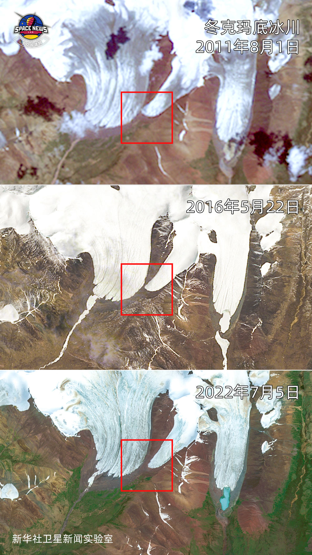 從冬克瑪?shù)妆ú煌攴菪l(wèi)星遙感圖像可以看出,在2011年冬克瑪?shù)妆ㄟ€是一個(gè)整體,此后就陸續(xù)分為大、小冬克瑪?shù)變蓷l冰川。紅框區(qū)域內(nèi)變化,說(shuō)明兩條冰川末端之間距離逐漸拉大,處于消融退縮。
