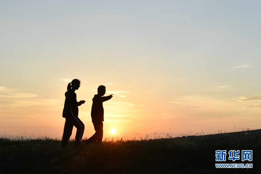 伴著夕陽,孔玥嶠正在和生態(tài)管護(hù)員交流工作。新華網(wǎng) 卡婭梅朵 攝