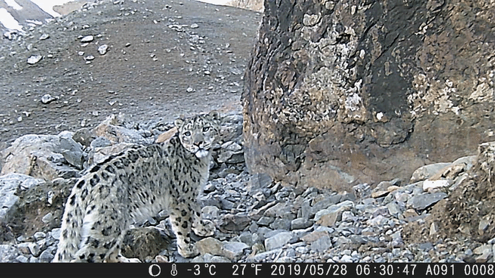 “我時(shí)常覺得,與其說是我們觀察雪豹,不如說是雪豹在觀察我們,它觀察我們,比我們觀察它要容易得多?!睋?jù)王大軍講述,有一次,團(tuán)隊(duì)追蹤到一只雪豹的身影停留在山間,但遠(yuǎn)遠(yuǎn)望去,只有一條尾巴露在外面。通過攝影設(shè)備拉近畫面,才發(fā)現(xiàn)原來那只雪豹的雙眼也正在透過巖石的縫隙,觀察著他們。