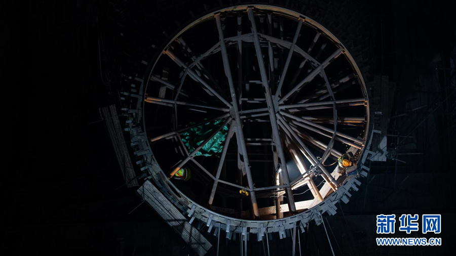 瑪爾擋公司工作人員在水電站地下廠房建設(shè)現(xiàn)場查看工程進(jìn)度。新華網(wǎng) 潘彬彬 攝