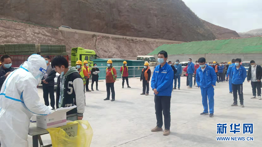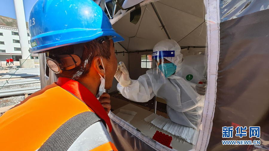 瑪爾擋水電站建設(shè)現(xiàn)場,施工人員排隊進(jìn)行核酸檢測。新華網(wǎng) 劉小芳 攝