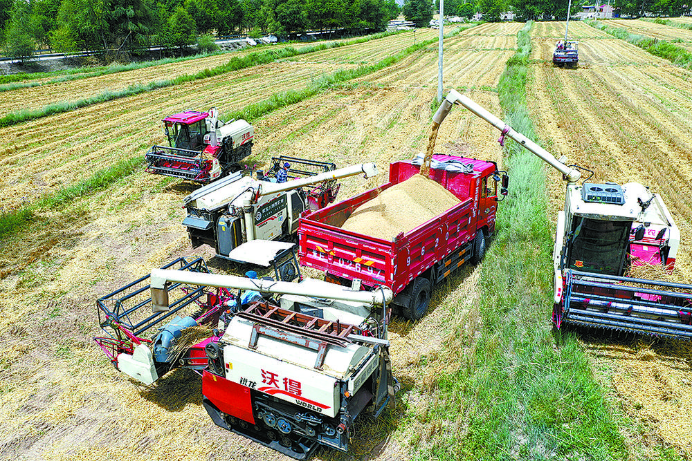 “這里是我們的小麥制種基地,目前我們的主推品種是京437和中麥175,京437品種畝產(一畝約等于0.067公頃)可達400千克左右。今年的冬小麥長勢良好,顆粒飽滿,用兩天時間將會把20公頃全部收完!”貴德縣金穗農業(yè)開發(fā)有限公司副經理余富強捧起剛收割的新麥,仔細查看,滿臉洋溢著豐收的喜悅。
