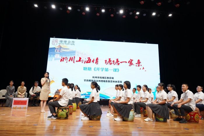 9月1日,在四川省甘孜州理塘縣二中報告廳內(nèi),進行了一場別開生面的開學(xué)第一課。相隔2500公里的四川省甘孜州理塘縣二中和浙江省杭州市錢塘區(qū)下沙中學(xué)的學(xué)子們,一起“跨越千山萬水”,通過視頻連線開展了一場充滿著喜悅、溫情、感動和希望的新學(xué)期課程。