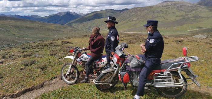 禾尼鄉(xiāng)派出所接到求助后,立即安排在附近開展工作的草原騎警隊警力寧紅玉、澤仁公布、格絨降措帶領(lǐng)熟悉附近地形的派出所群防群治義警隊員丁真稱乃,騎摩托車趕赴現(xiàn)場。期間,草原騎警隊協(xié)調(diào)附近牧民租借3臺摩托車前往迷路地方尋找,因迷路地點在海拔4800多米的高山,草原騎警隊翻山越嶺,經(jīng)過3個多小時的尋找,與迷路人員家屬在一山坳處找到德洛。家屬滿含熱淚的看著草原騎警隊隊員說,“麻煩你們了,謝謝你們了,你們辛苦了。”