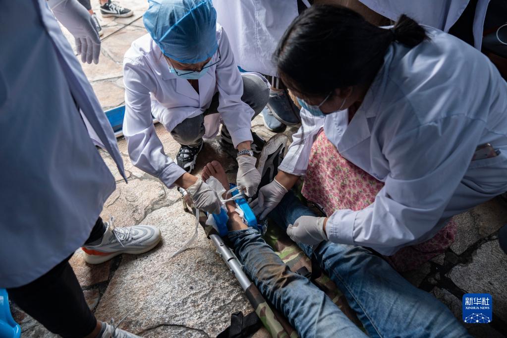 9月6日,在四川甘孜州瀘定縣磨西鎮(zhèn)海螺溝廣場受災(zāi)群眾臨時安置點,醫(yī)護人員為傷員包扎。新華社記者 才揚 攝