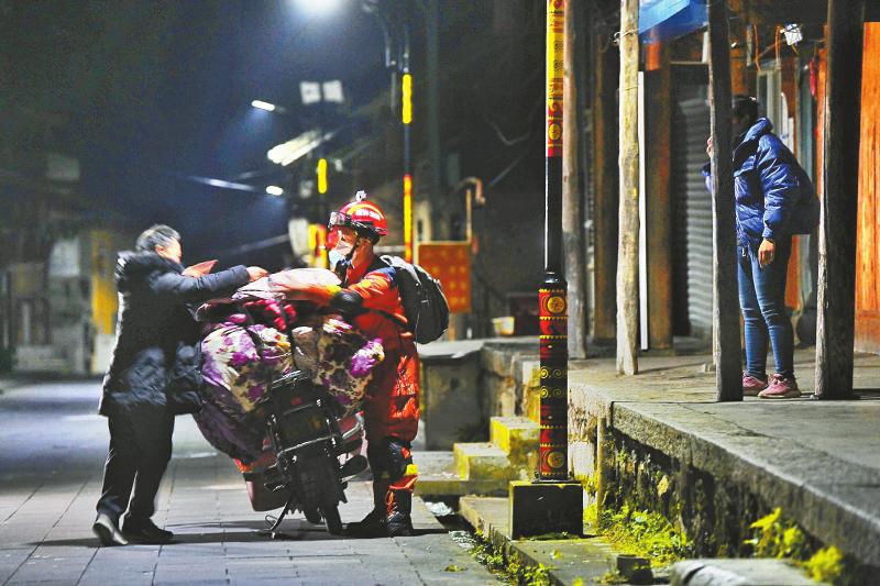 在燕子溝鎮(zhèn)新興老街,搜救排查發(fā)現(xiàn)一戶群眾房屋存在危險,消防隊員馬上幫助住戶收拾棉被和衣物,將其轉(zhuǎn)移到安置點。