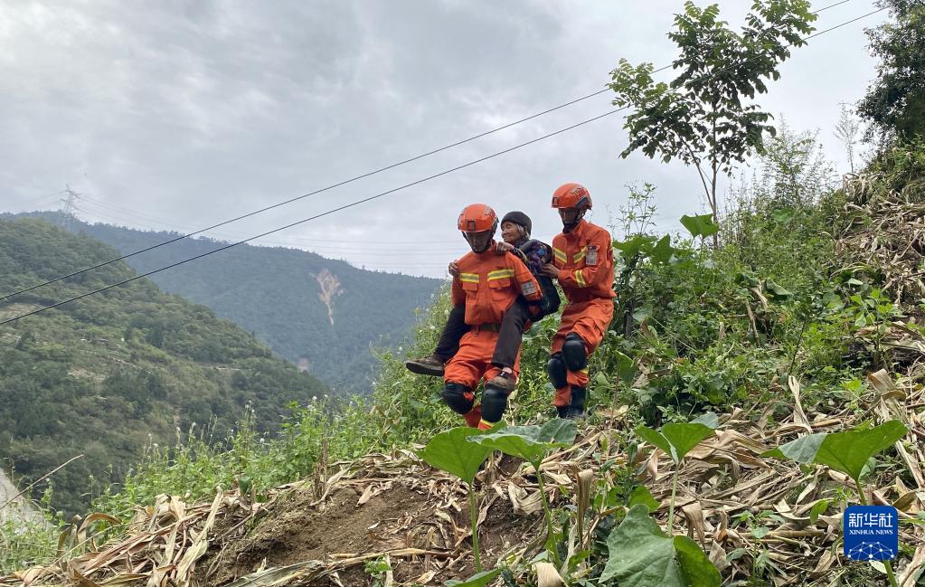9月6日,四川森林消防總隊(duì)甘孜支隊(duì)消防員將一位老人從瀘定縣得妥鎮(zhèn)紫雅場(chǎng)村安全轉(zhuǎn)移出去。新華社 魏紅 攝