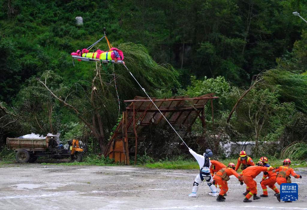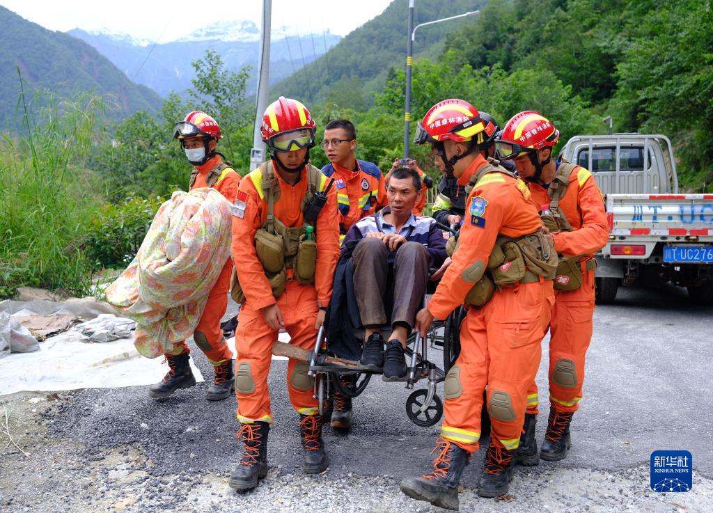 9月6日,在瀘定縣磨西鎮(zhèn)共和村,救援人員轉(zhuǎn)移傷員。新華社 程雪力 攝