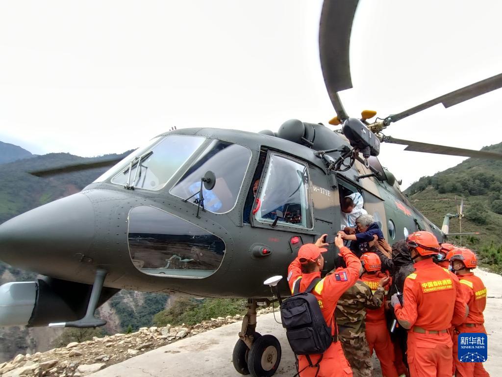 9月6日,西部戰(zhàn)區(qū)空軍某部緊急出動(dòng)直升機(jī)在瀘定縣轉(zhuǎn)移群眾。新華社發(fā)(胡建軍 攝)