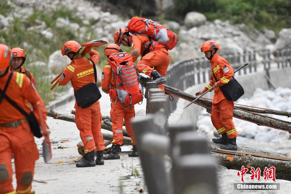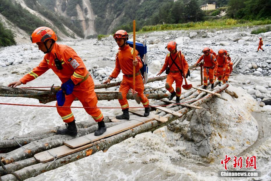 9月6日,四川甘孜州瀘定縣磨西鎮(zhèn),甘孜州森林消防支隊(duì)康定中隊(duì)隊(duì)員通過(guò)簡(jiǎn)易木橋,深入山區(qū)開(kāi)展救災(zāi)工作。9月5日,四川瀘定發(fā)生6.8級(jí)地震。 中新社記者 張浪 攝