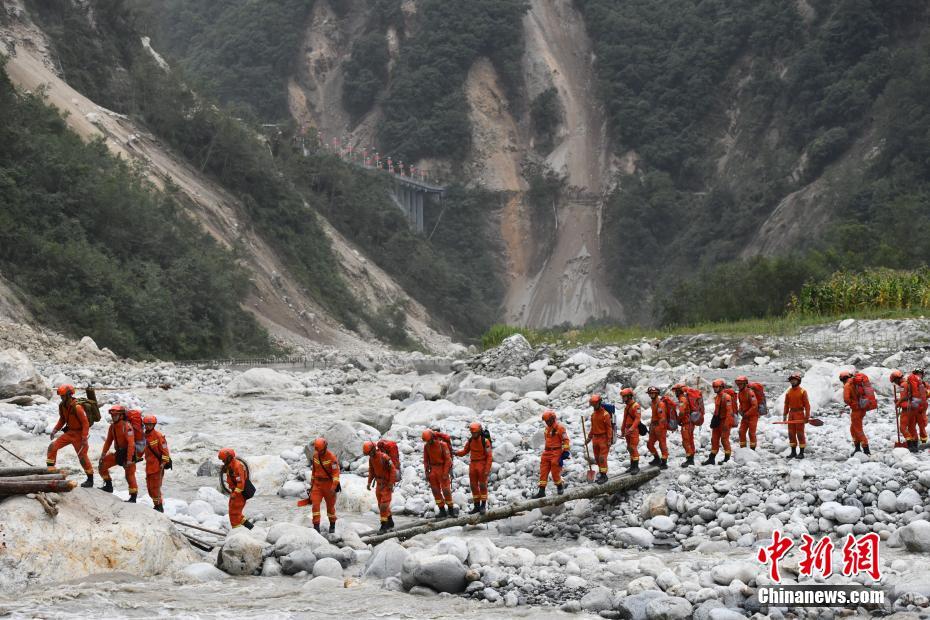 9月6日,四川甘孜州瀘定縣磨西鎮(zhèn),甘孜州森林消防支隊(duì)康定中隊(duì)隊(duì)員徒步深入山區(qū)開(kāi)展救災(zāi)工作。9月5日,四川瀘定發(fā)生6.8級(jí)地震。 中新社記者 張浪 攝