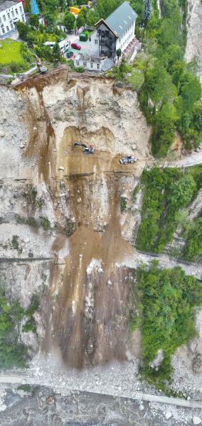 9月6日,瀘定縣磨西鎮(zhèn)通往海螺溝景區(qū)的道路被阻斷,蜀道集團(tuán)施工人員在冒險搶通道路。 四川日報全媒體記者 楊樹 攝