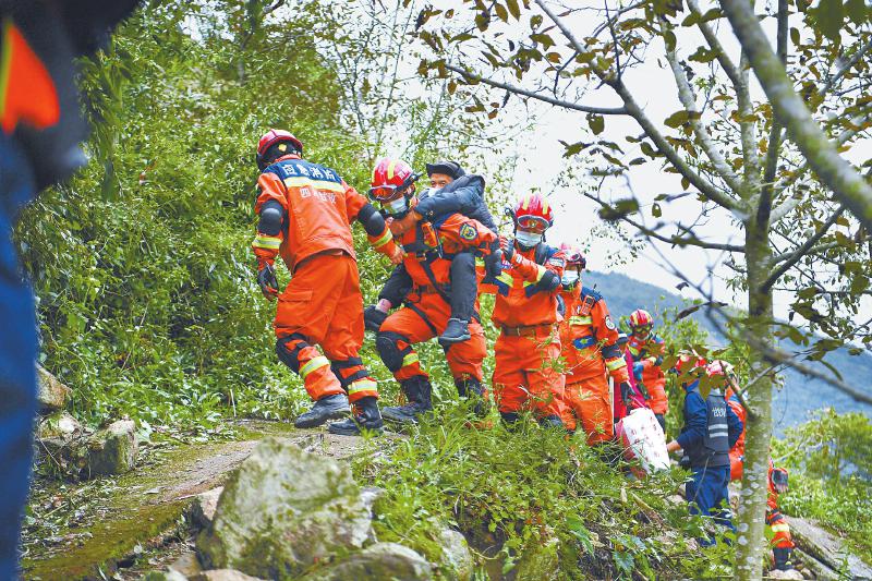 救援隊(duì)員協(xié)助紫雅場村最后一批村民下山,他們隨后將通過水路轉(zhuǎn)移至設(shè)在得妥鎮(zhèn)場鎮(zhèn)的受災(zāi)群眾安置點(diǎn)。 四川日報(bào)全媒體記者 楊樹 攝