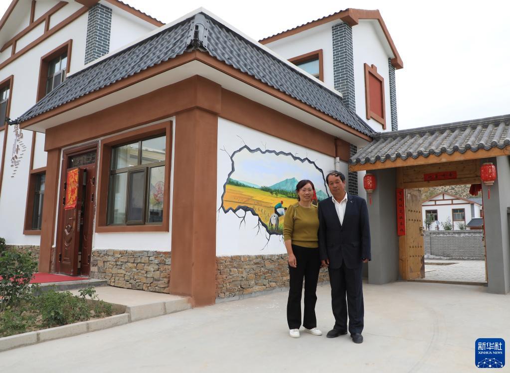 9月15日,在甘肅省武威市祁連鎮(zhèn)祁連村下河安置點,村民鄧發(fā)斌和妻子在新房門前合影。新華社記者 張智敏 攝