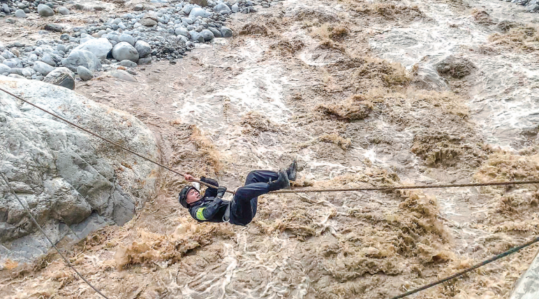 焦慮之際,另一組隊(duì)員沿河搜尋發(fā)現(xiàn)一塊離河對(duì)岸較近的巨石,率先過(guò)河的戰(zhàn)友打錨點(diǎn)接應(yīng),很快在兩邊架起一座“飛索橋”,曾經(jīng)當(dāng)過(guò)高山向?qū)У耐跞f(wàn)銳第一個(gè)沖上去,四肢倒掛,背對(duì)激流,飛快移向?qū)Π?。緊接著,隊(duì)員沙馬澤呷躍上飛索。鋼索和飛索兩路同時(shí)過(guò)河,隊(duì)伍很快全部來(lái)到對(duì)岸。