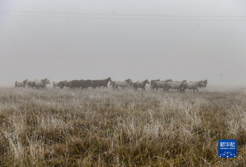 深秋的清晨,若爾蓋大草原籠罩在一片晨霧中,北風(fēng)卷起牧草,枯黃的草葉和草梗上結(jié)滿了白霜。