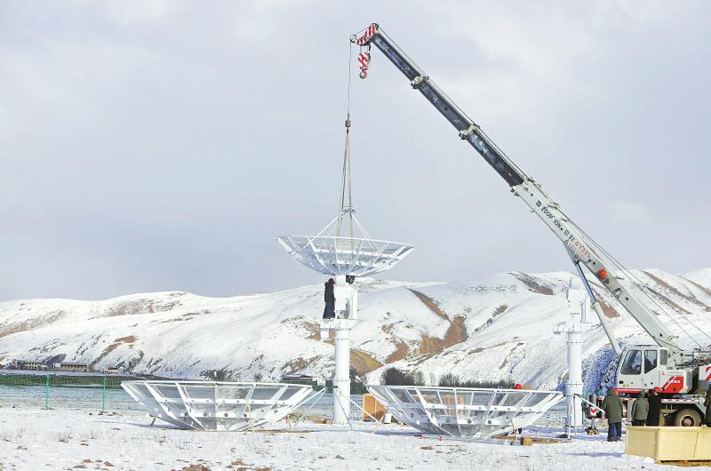 2022年11月13日 工人正在安裝圓環(huán)陣太陽射電成像望遠(yuǎn)鏡設(shè)備的最后一個天線面。