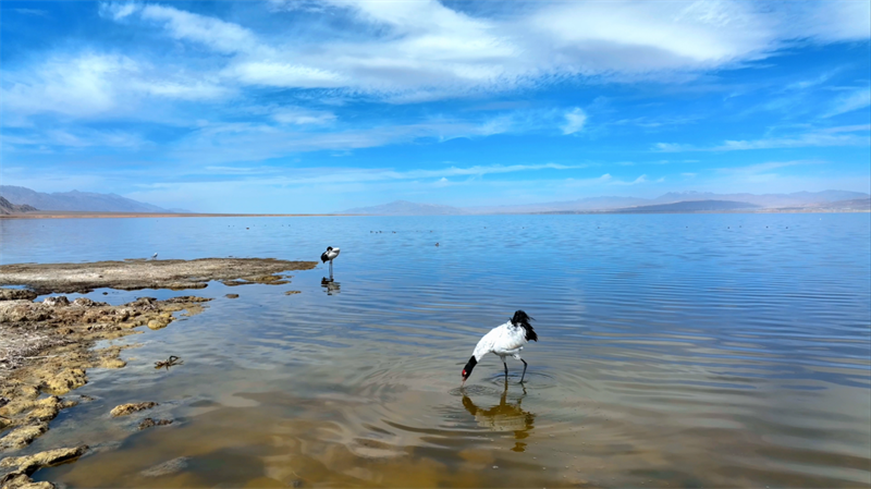 初冬時(shí)節(jié),在青海省海西蒙古族藏族自治州烏蘭縣都蘭湖國(guó)家濕地公園內(nèi),四只國(guó)家一級(jí)保護(hù)動(dòng)物黑頸鶴,踏著黑色細(xì)長(zhǎng)的腿在湖中閑庭信步,與斑頭雁、赤麻鴨一起嬉戲覓食,盡顯柴達(dá)木盆地濕地生態(tài)之美。