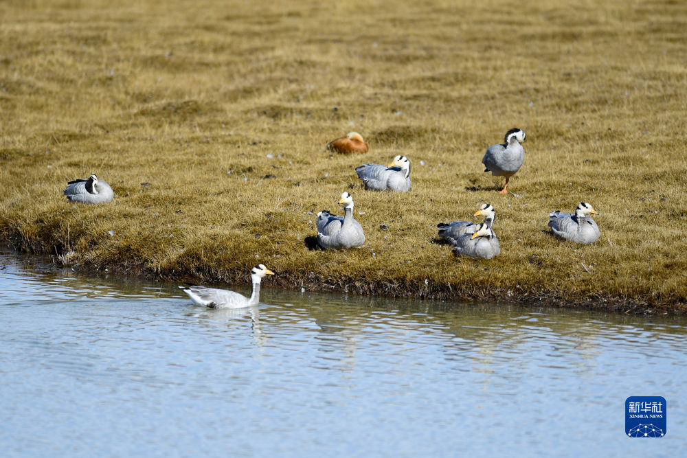 在三江源國(guó)家公園黃河源園區(qū)拍攝的一群斑頭雁。(新華社記者 李占軼 攝)