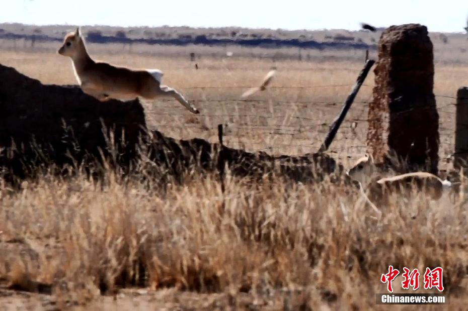 圖為普氏原羚跳過網(wǎng)圍欄。剛察縣融媒體中心供圖