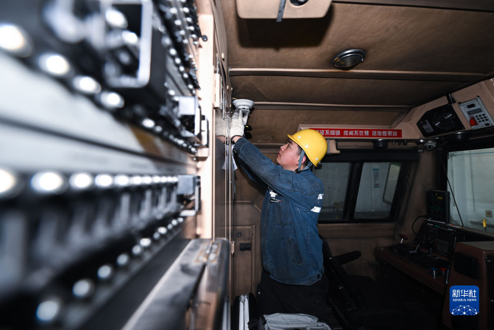 2月4日,在格爾木機務(wù)段檢修車間,馬國仁在駕駛室檢查。新華社記者 張龍 攝