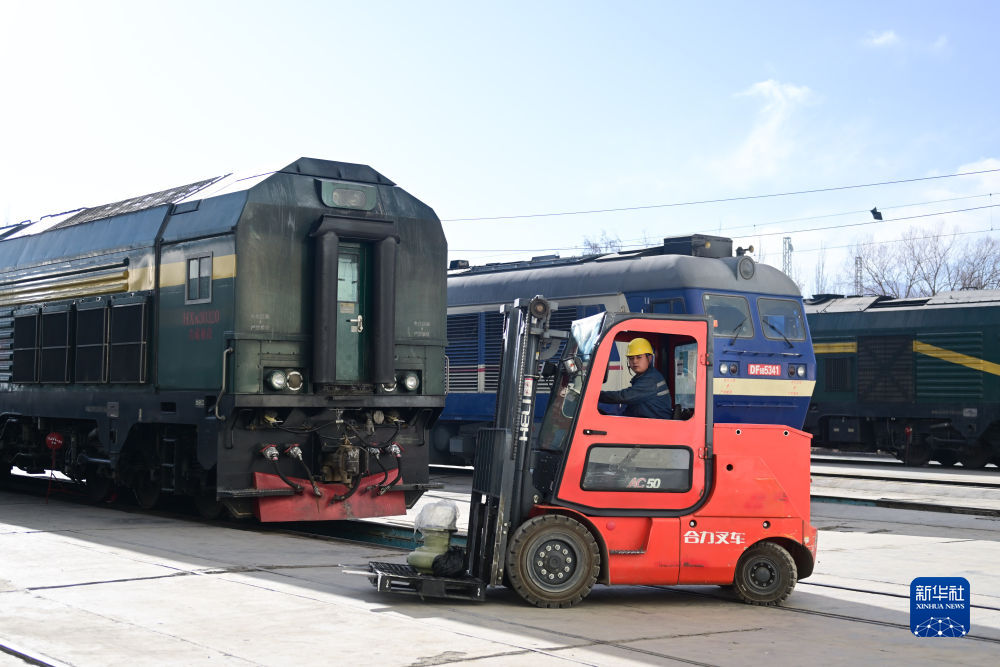 2月4日,在格爾木機務(wù)段檢修車間,馬國仁駕駛叉車搬運部件。新華社記者 張龍 攝