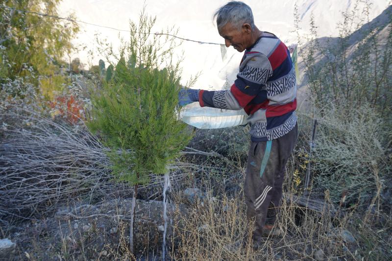 1950年出生在茂頂村木達水村民小組的丁爭,小時候多次看到雨季村里洪水成災,泥石流橫行,山體滑坡的場景。那時經濟落后,村民日子過得苦。丁爭隨母親去頭人家放牛,由于天氣炎熱,饑渴難耐,母親就摘一個頭人家蘋果充饑,被頭人關了3天3夜。1957年,迪慶發(fā)展迎來新曙光,丁爭家分到了田、牲畜、果樹,當家做主人,從此過上了新生活。2007年,丁爭兒孫滿堂,家務事不用操心,他就想植樹造林、保護生態(tài),防止山洪暴發(fā)和水土流失,造福子孫后代。于是,他拿著家里的鎬、盆,踏上植樹造林的漫漫長路。 在植樹造林的初期,丁爭老人靠自家的舊桶舊盆給樹苗澆水。隨著旭龍電站、忠態(tài)水庫等項目進場施工,丁爭老人就撿拾一些舊水管、舊鐵絲,把水引到離幼苗最近的地方,以便澆水。用廢棄的鐵絲把樹苗固定好,以免風吹雨打樹苗飄搖致根系斷裂,影響生長。起初由于管理經驗不足,澆水困難,1年種100棵樹苗,成活僅幾棵,但他沒有退縮,沒有喪失信心,查找成活率不高的原因,采取相應的改進措施,逐年提高了樹苗成活率。