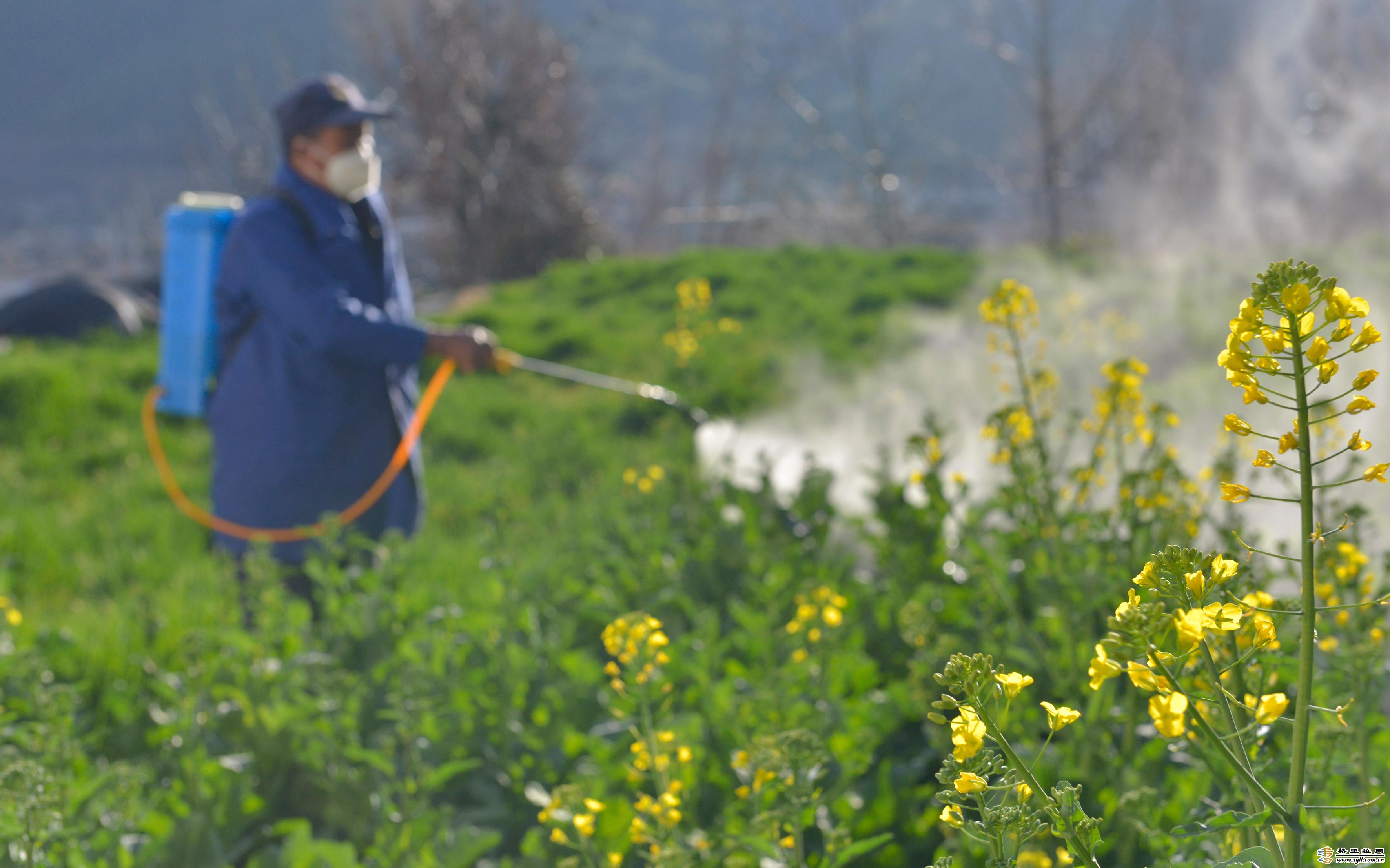 各地農(nóng)民搶抓農(nóng)時(shí)進(jìn)行田間管理,圖為香格里拉市金江鎮(zhèn)吾竹村格瓦組村民和麗光在油菜地里噴灑農(nóng)藥。