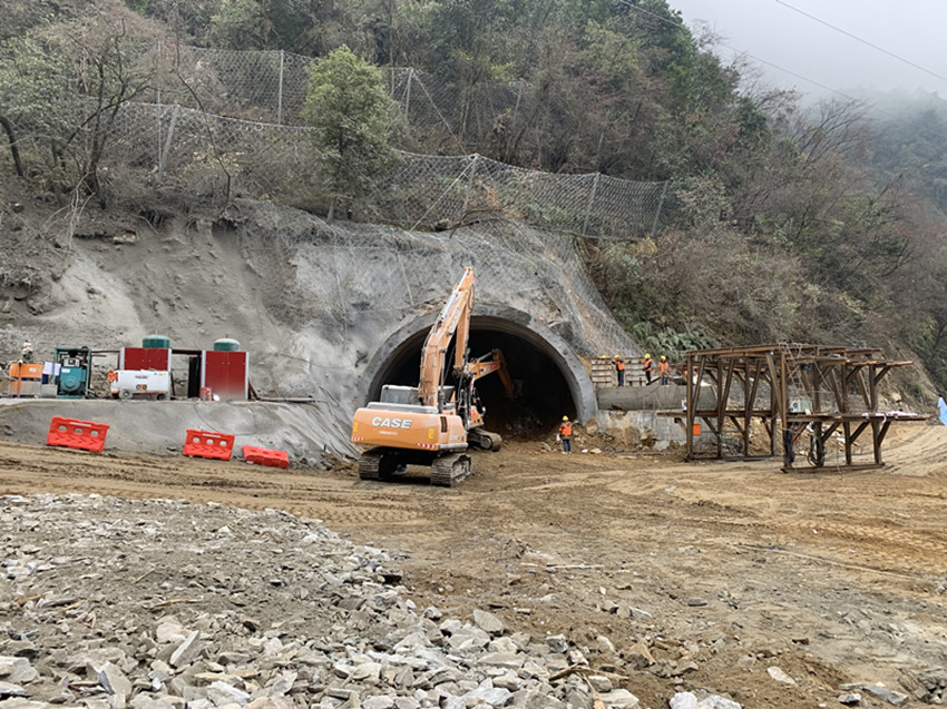 圖為海螺溝景區(qū)道路(磨西鎮(zhèn)至三號(hào)營(yíng)地)共和2號(hào)隧道出口正在施工。